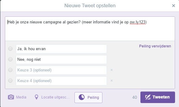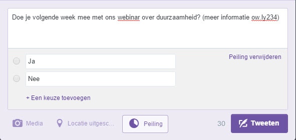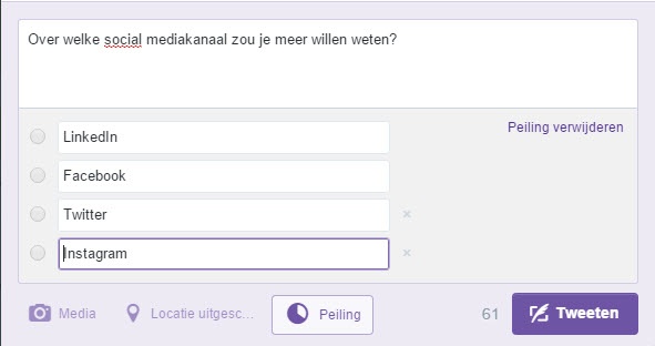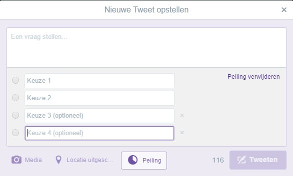 Het aanmaken van een Poll doe je in het scherm dat je gebruikt om Twitterberichten te schrijven.
